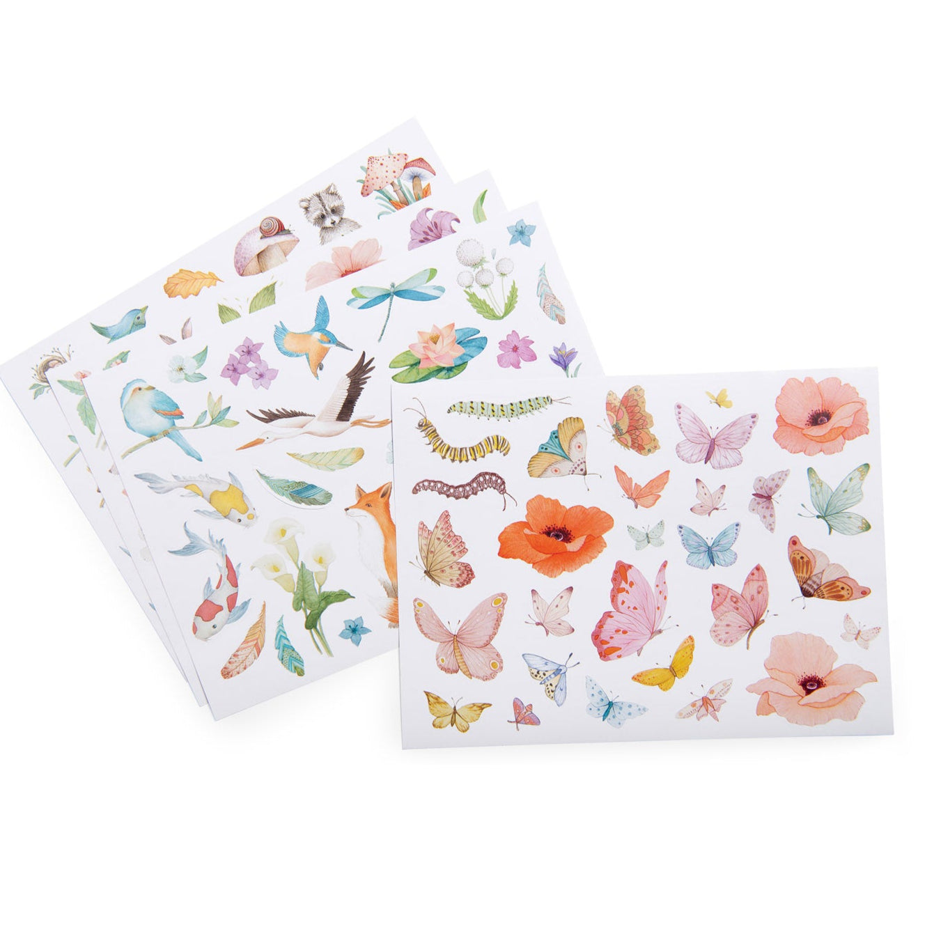 Paket med 108 flyttbara klistermärken med blommor och djur.