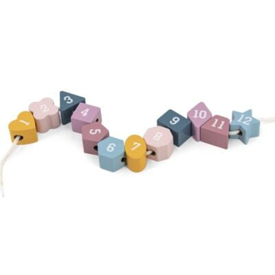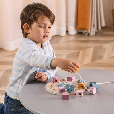 Lärorik klocka i trä med avtagbara klossar med siffror på i olika färger och former. Pedagogisk leksak där man i tidig ålder kan börja med att lära sig siffror, färger och former och med tiden lära sig hur mycket klockan är. Klockan visar timmar och minuter.