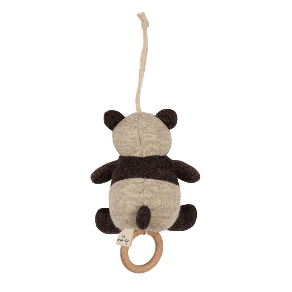Designad med en stickad hängslinga och en leksak som är lätt för små händer att greppa.