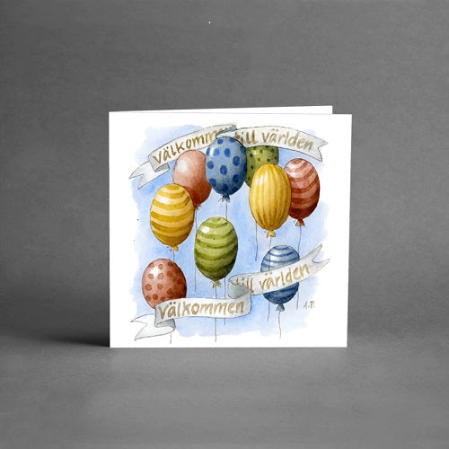 Text: "Välkommen till världen". Motiv av färgglada ballonger.
