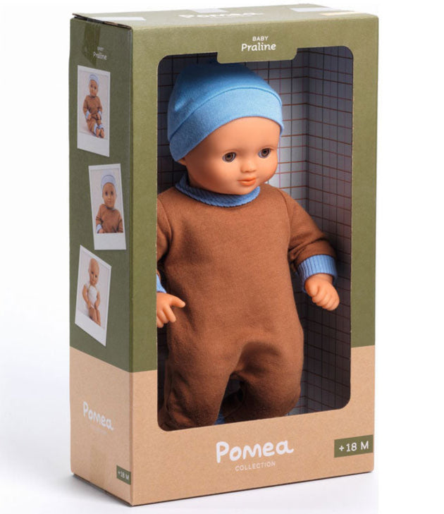 Med sina vackra bruna ögon och snygga kläder är baby Praline från Djeco en söt docka med en storlek och lätt vikt som är perfekt anpassad för att passa i famnen hos små barn.