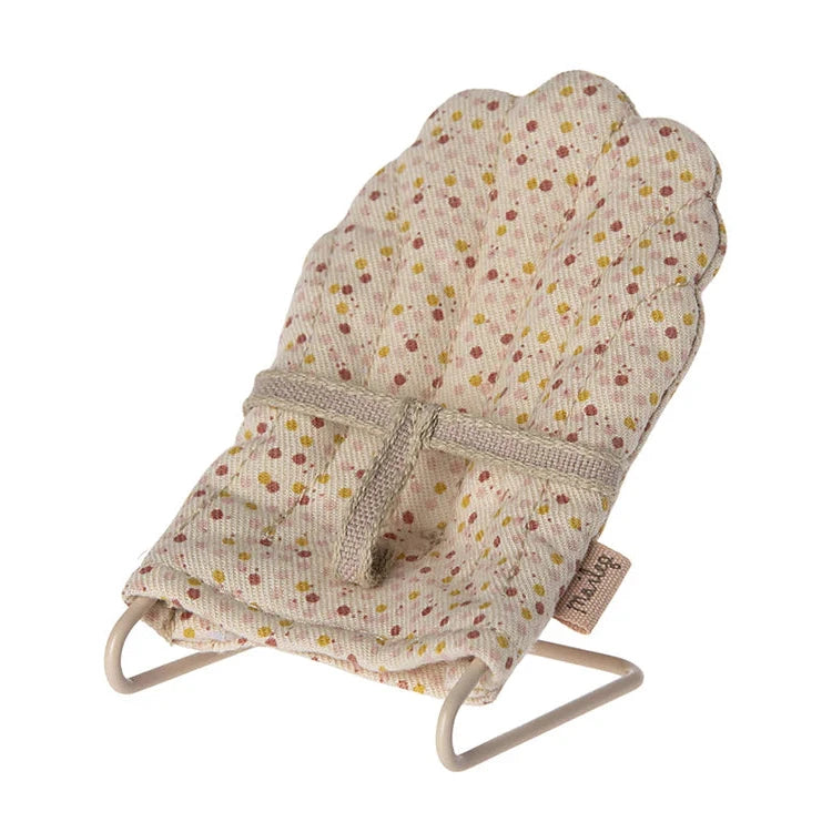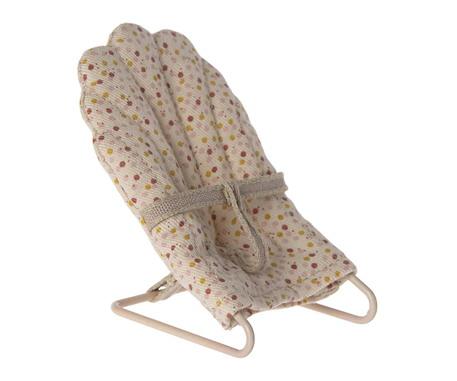 En underbar liten stol för de allra minsta! Med denna babysitter är det lätt att få dina små vänner att sova gott. Basen är gjord av metall och täckt av det vackraste prickiga tyget. Stolen passar perfekt till baby möss och små kaniner.
