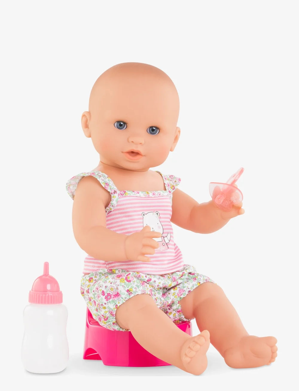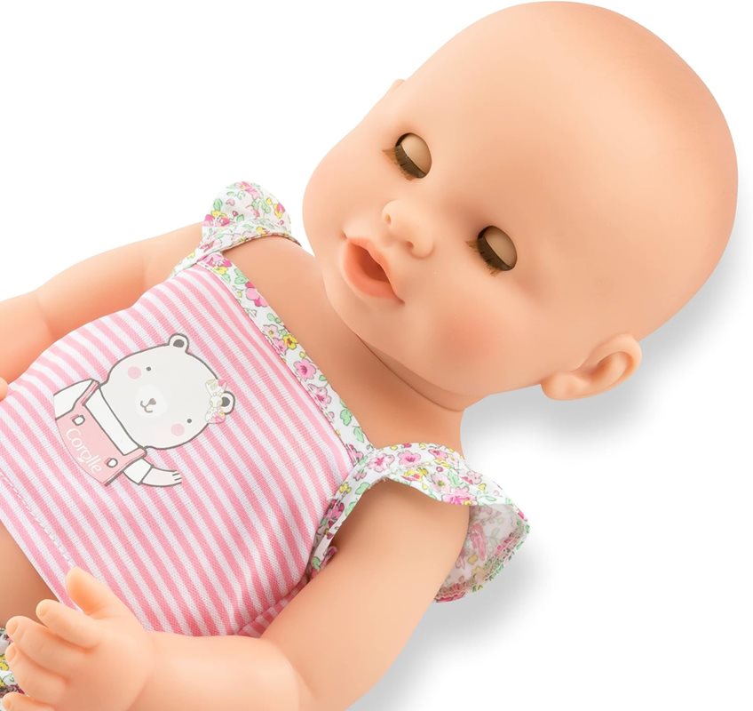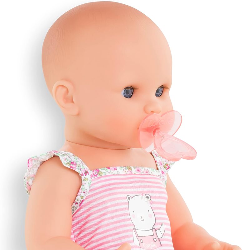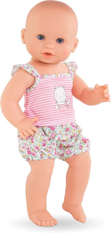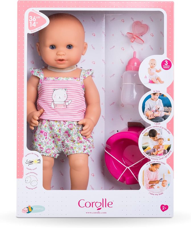 Emma är en baddocka som också kan matas med vatten i den medföljande nappflaskan, och sedan kissa på pottan. Perfekt för barn som pott-tränas! För att få dockan att kissa, placera den i sittande ställning och tryck den på magen. Emma är 36 cm, har blå blundögon och en kropp helt i vinyl. Passar barn från 2 år och uppåt. Allt på bilden ingår. Precis som alla dockor från Corolle har Emma en svag doft av vanilj. Emma kan ta napp (som medföljer).