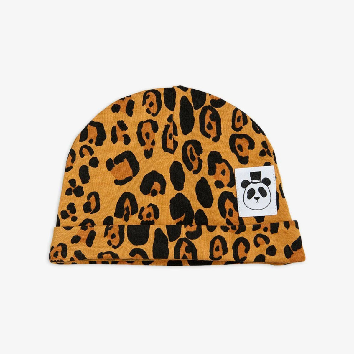 Mössa med Leopard-print tillverkad i mjuk TENCEL™ Lyocell med komfortstretch. Mössan har uppvikt kant och ett Mini Rodini Panda-märke.