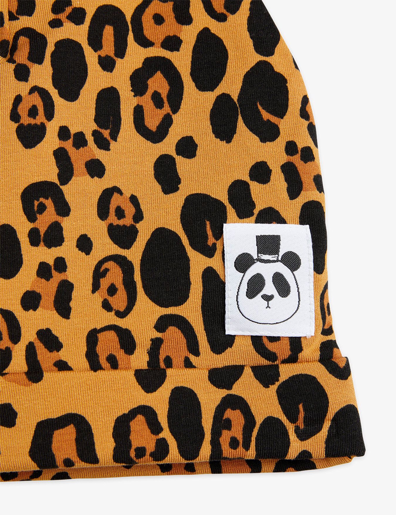 Leopardprintad mössa i dubbla lager lyocell med komfortstretch. Mössan har uppvikt kant och ett pandamärke i nederkant fram.