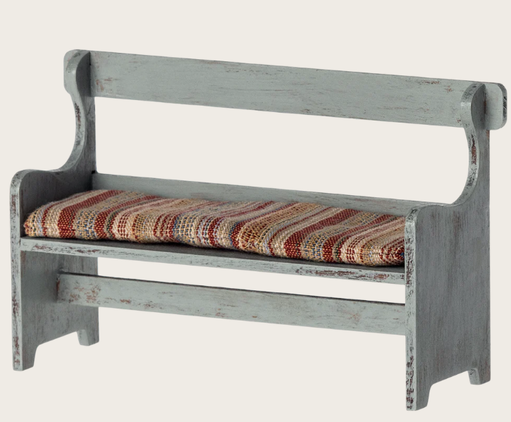En träbänk som är perfekt för musfamiljen. Den har en vacker handmålad vintage-look, så finishen kan variera. Det finns en mjuk kudde på sitsen för att göra det bekvämare för mössen.