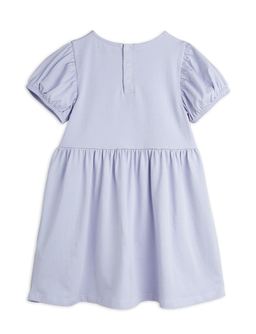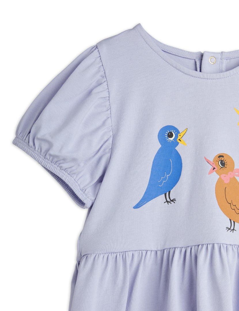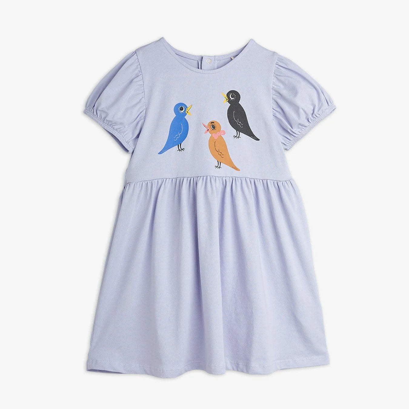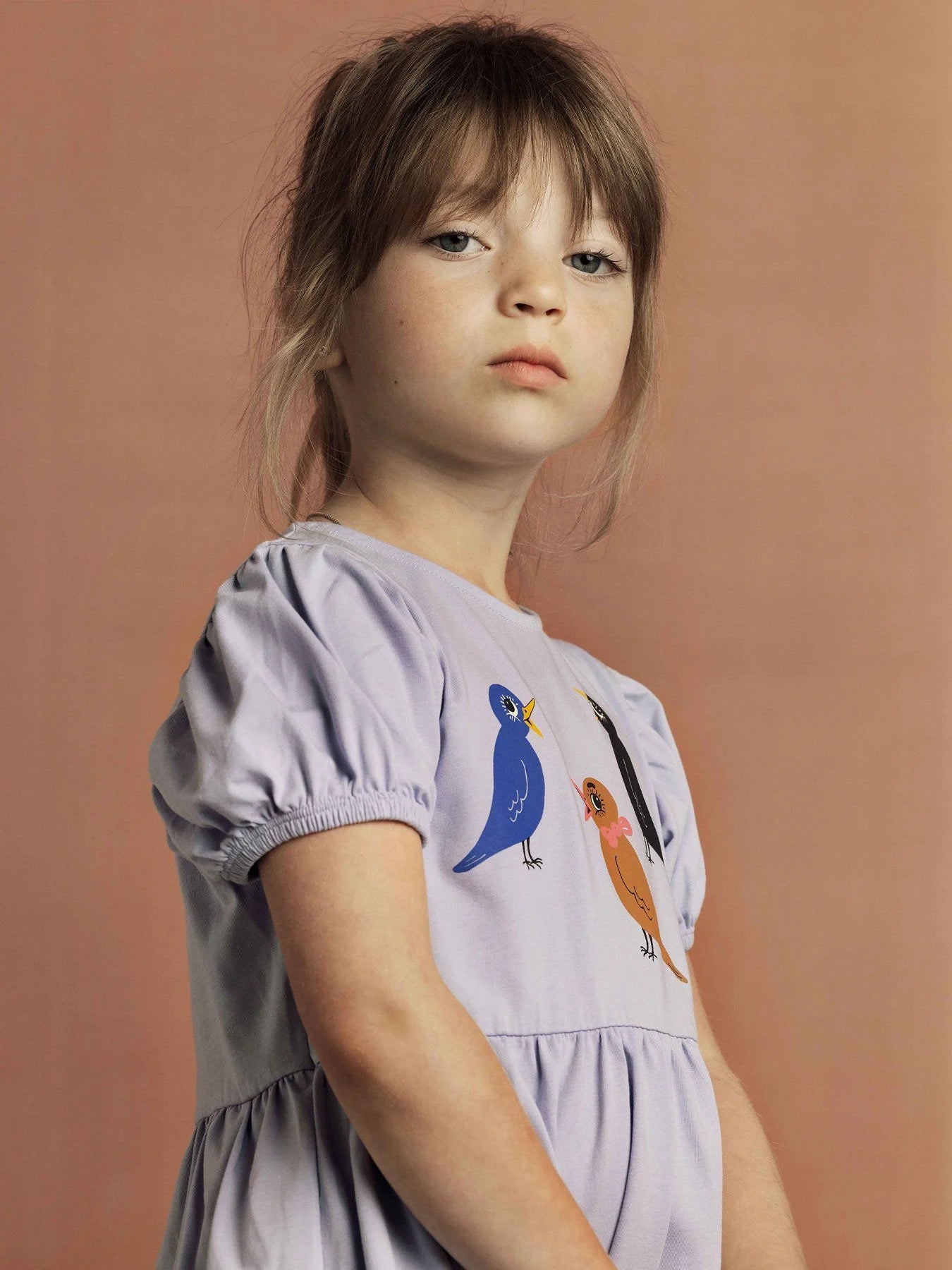 Kortärmad klänning i ekologisk bomull med en inslag av stretch. Designad med puffärmar, hög midja och ett flerfärgat fågeltryck framtill. Avslutad med knappar bak för enkel påklädning.
