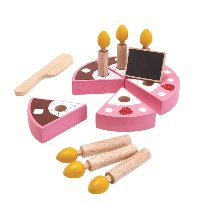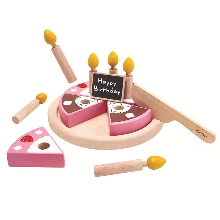 Tvåsidig födelsedagstårta. Vändbara tårtbitar för olika tårtor och sex ljus som går att ta bort. Tårtan går även att dela i sex bitar och ligger fint på det medföljande fatet.