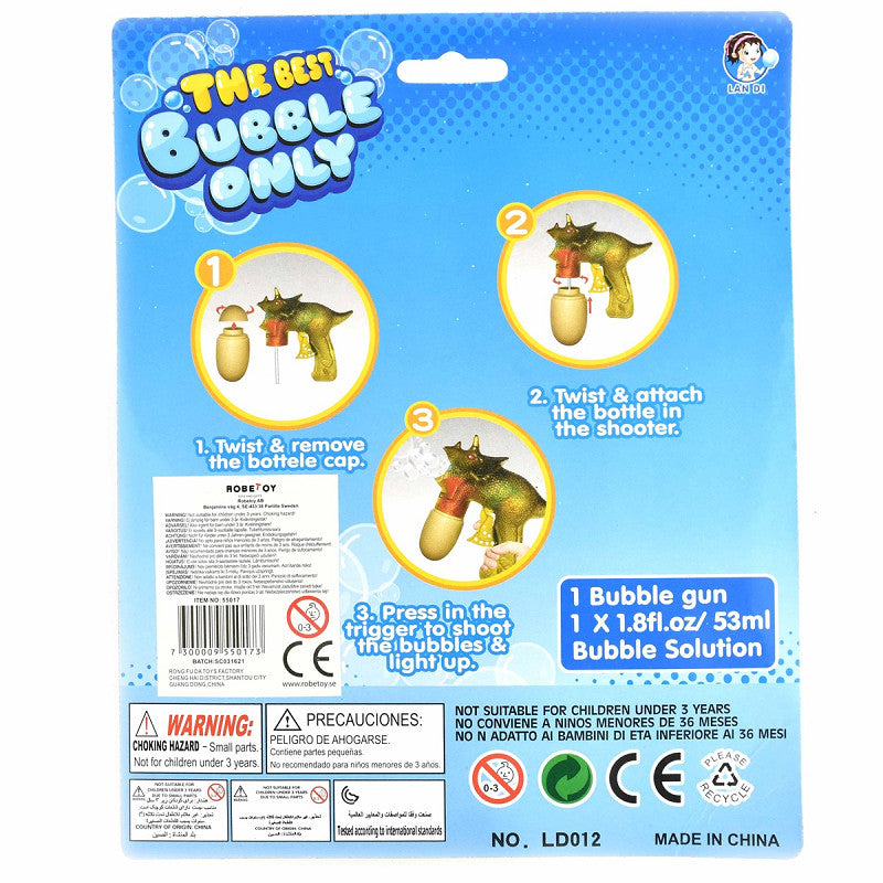 Bubble Gun Dinosaur kommer med en flaska såpbubbelvätska (53 ml) som enkelt fästs under pistolen. Den är tillverkad i plast och finns i flera färgglada varianter – vilken färg du får blir en spännande överraskning!