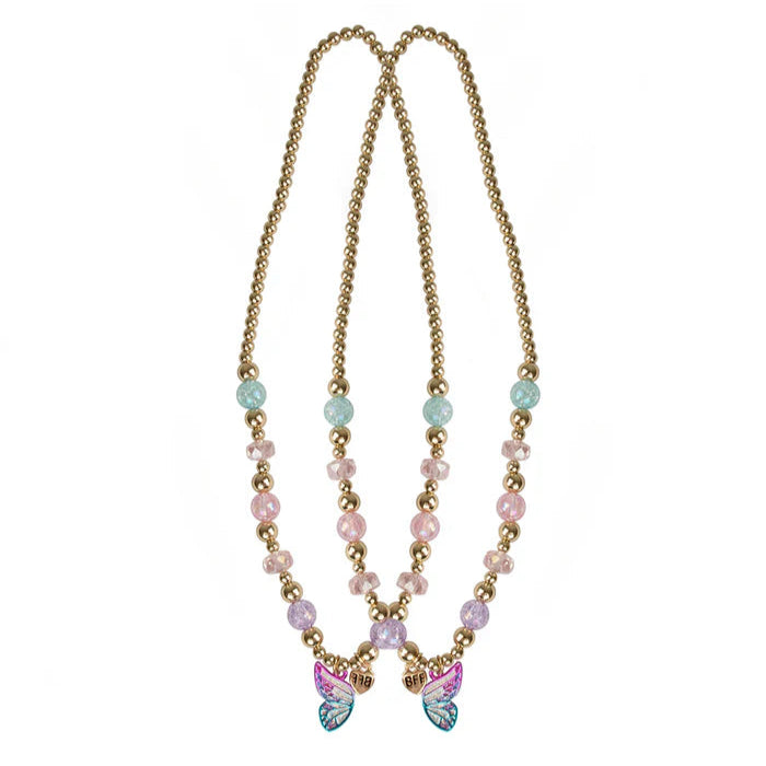 Dela kärleken med din bästa vän med våra Butterfly Wishes BFF-halsband! Det här setet innehåller två guldfärgade halsband med pärlor, med varsin halva av ett fjärilshänge och ett gyllene BFF-hjärta på varje. Våra smycken för barn är trädda med dubbel resår för extra hållbarhet.
