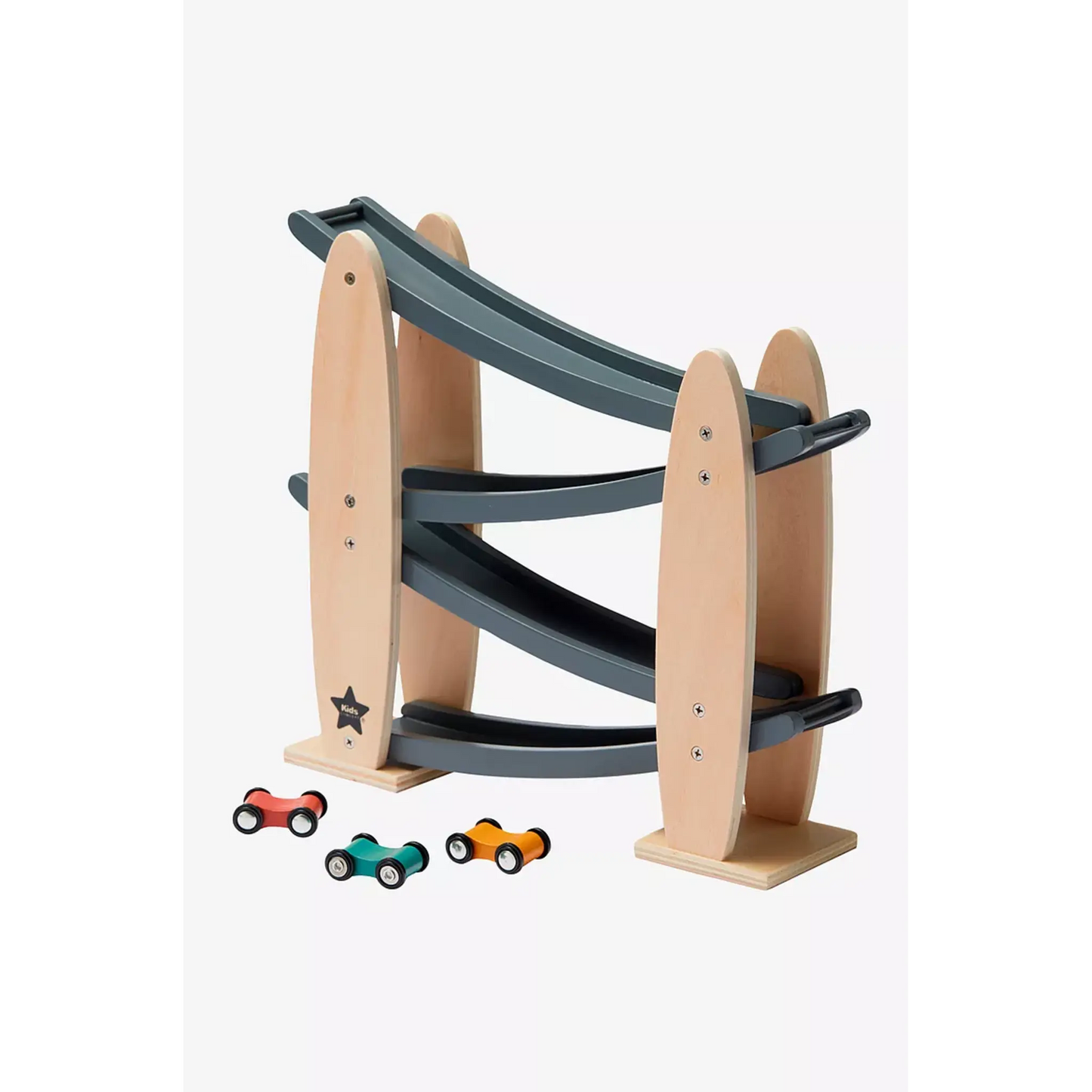 Bilbana i tre nivåer med smart konstruktion. Nivåerna hänger ihop med varandra. De tre bilarna åker hela vägen ner när man släpper dem från toppen. Spännande leksak som fångar barnens uppmärksamhet samtidigt som de tränar hand-öga-koordination och logiskt tänkande. Dessutom utvecklar de sin kommunikations- och samarbetsförmåga genom att turas om att köra bilarna.