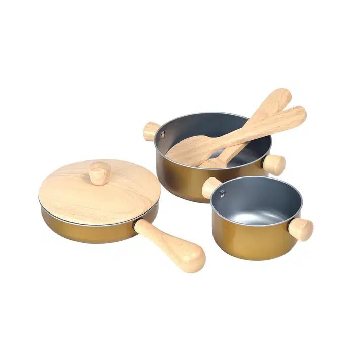 Kastrull-set i trä och metall som barnet kan leka med i timmar.