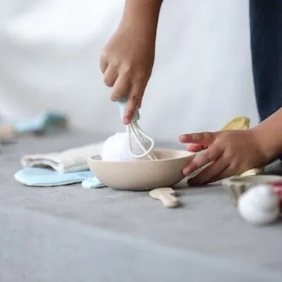 Skål, visp, gräddklickar, formar, smet, mjöl, ugnsvante, kniv, och plåt.