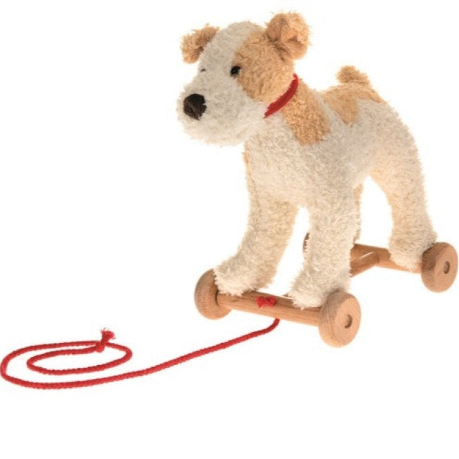 Här kommer Eliot på sina små trähjul! Han är redo att följa sin herre vart han än går! En vintagelook och en mycket mjuk päls att älska och krama.