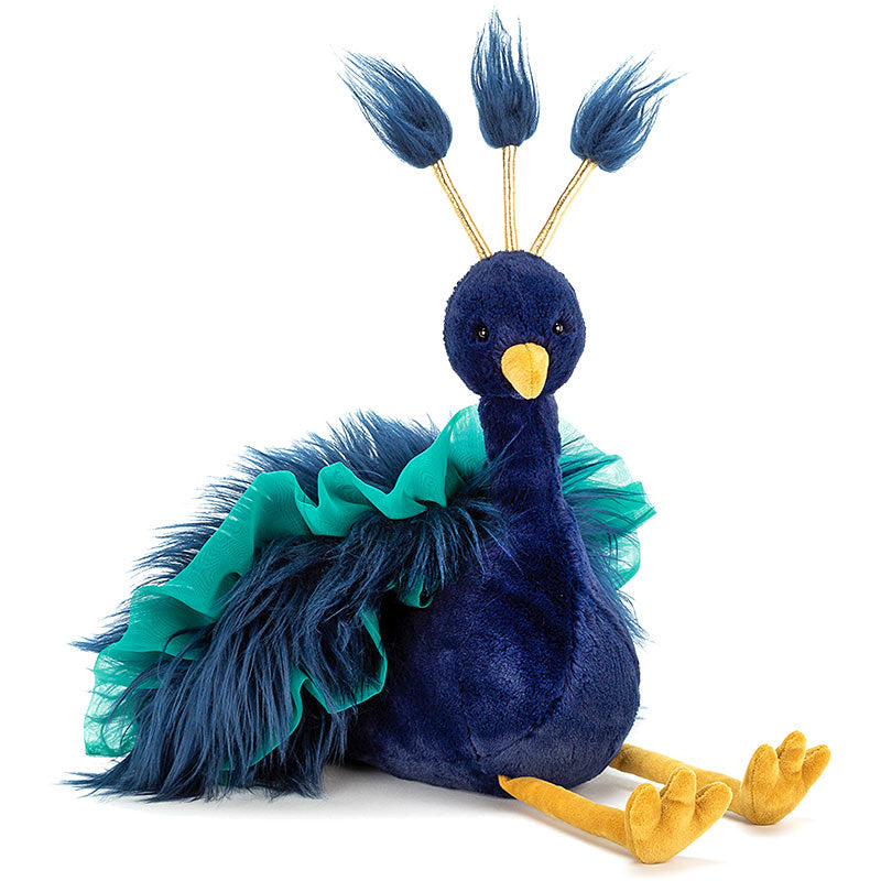 Denna Jellycat Electra Plume Peacock är en vackert mjuk och fantastiskt fjäderlik fågel. Vår indiska påfågel har en vacker blå fjäderdräkt med en gyllene näbb, långa floppiga ben, lyxiga gröna organza volanger och en superfluffig huvudprydnad.
