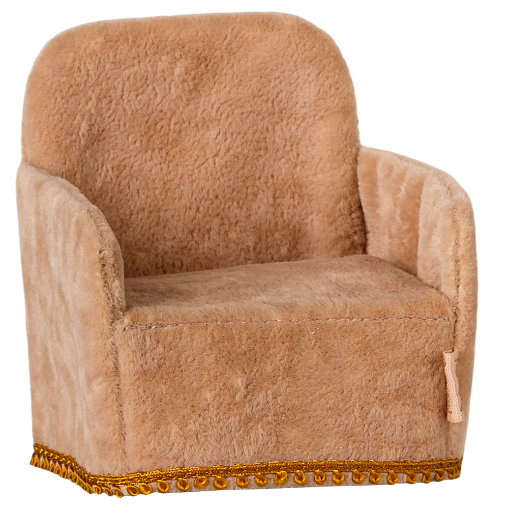 Skapa en mysig plats i din Maileg-värld med denna rosa miniatyrfåtölj. Kombinera med ett litet bord, lampa och andra Maileg möbler för att inreda en varm och inbjudande miljö för lek eller samling.