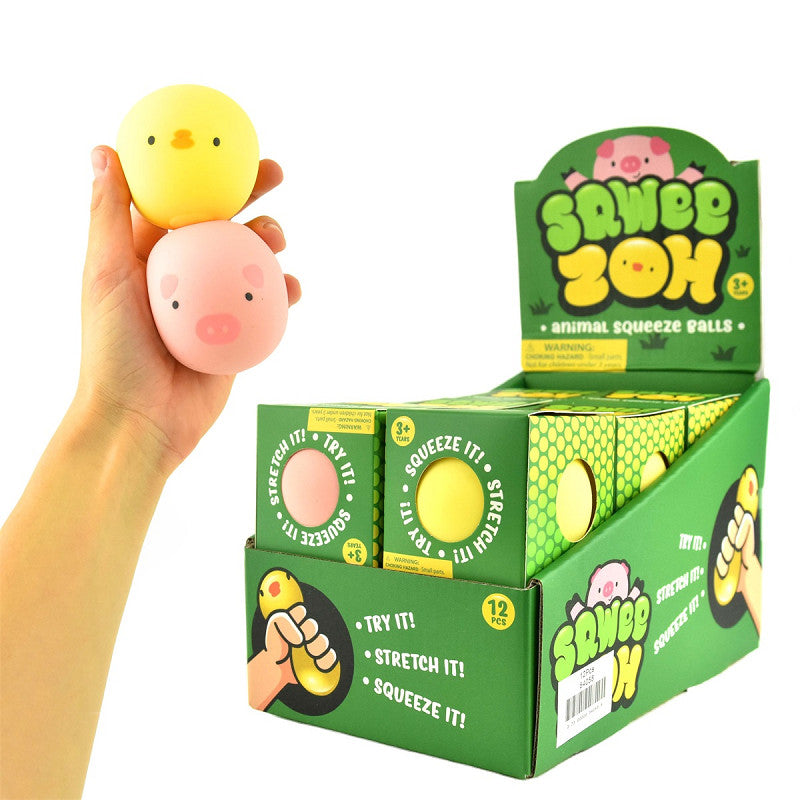 Djur Stressboll omfattar en stretchig mjuk squeeze boll och leksak med sött djuransikte föreställandes en gris i rosa eller en kyckling i gult.