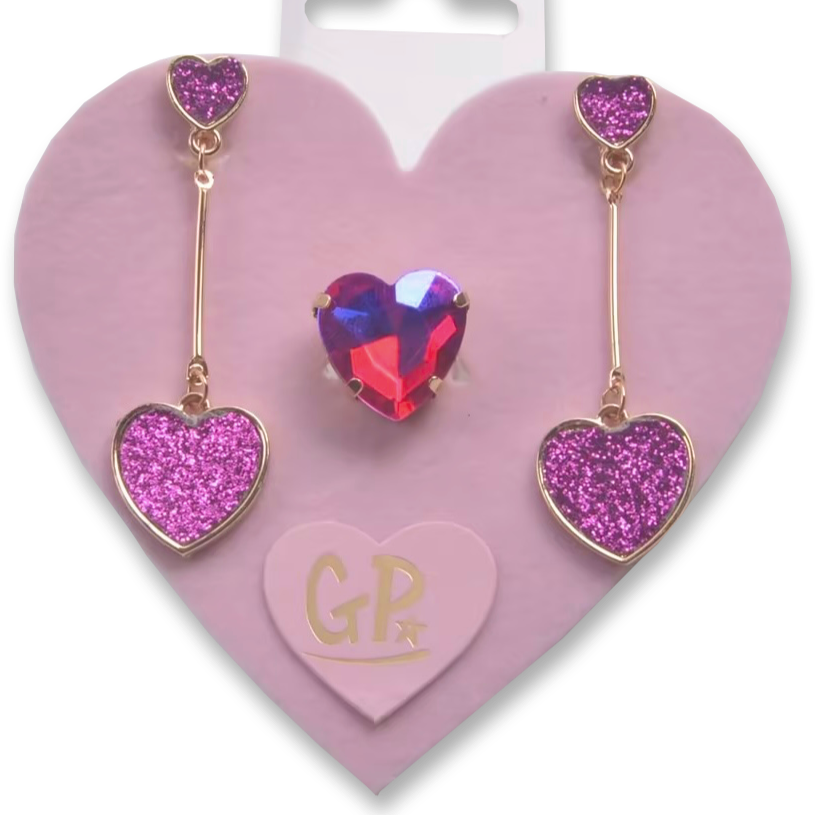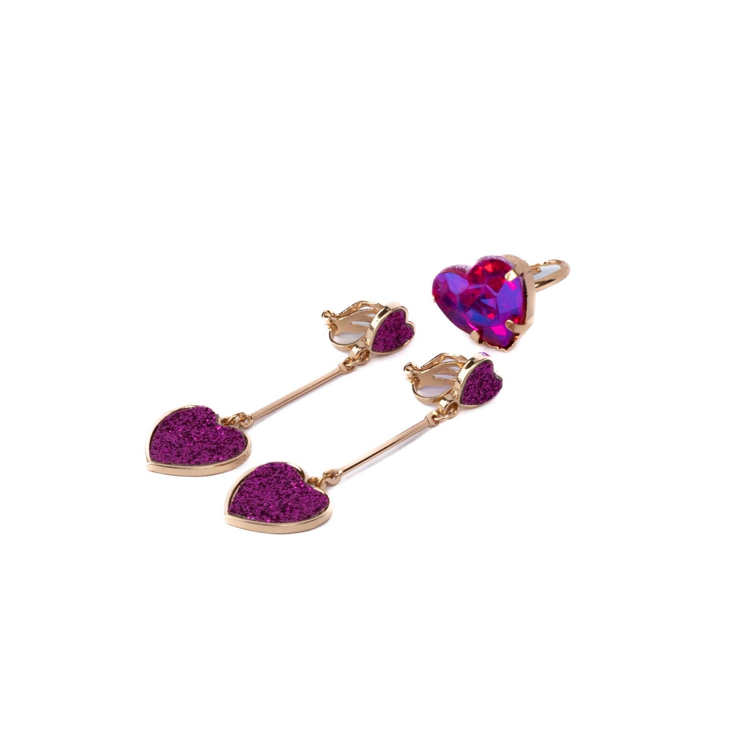 Det här charmiga setet har förtjusande lila hjärtformade clipörhängen och som är perfekta för att lägga till lite färg och roligt till vilken outfit som helst. Tillsammans med en matchande ring är detta set designat för enkel bäring och komfort.