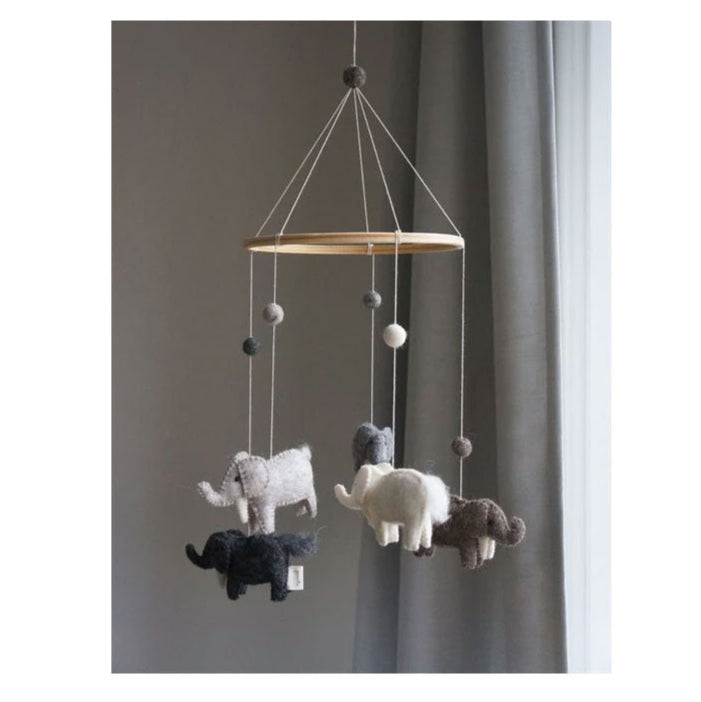 Söt mobil med olika grå elefanter. Mobilen är vackert inslagen med ett sött band - perfekt present till en babyshower, födelsedag eller som mammapresent.