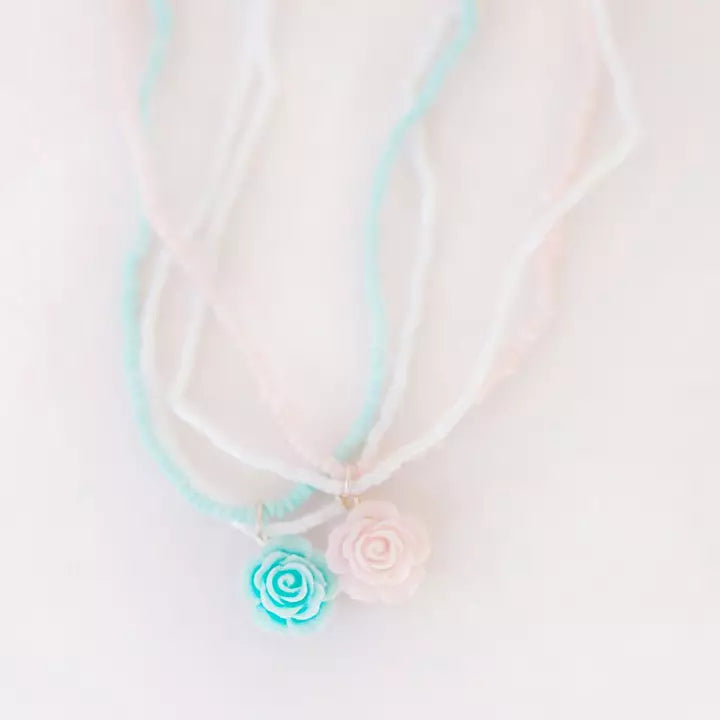 Romantiskt barnhalsband med en härlig ros. Finns i Rosa och Turkos. Rekommenderas ej för barn under 3 år.