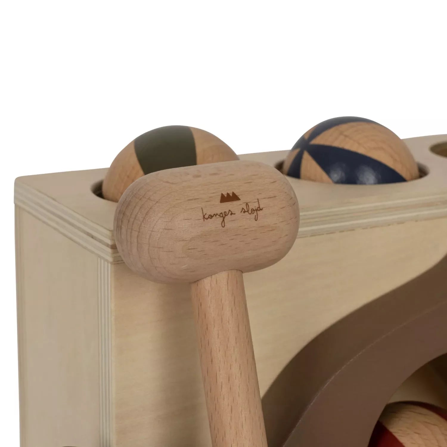 Ett roligt hammarspel i trä med 3 bollar och en hammare.