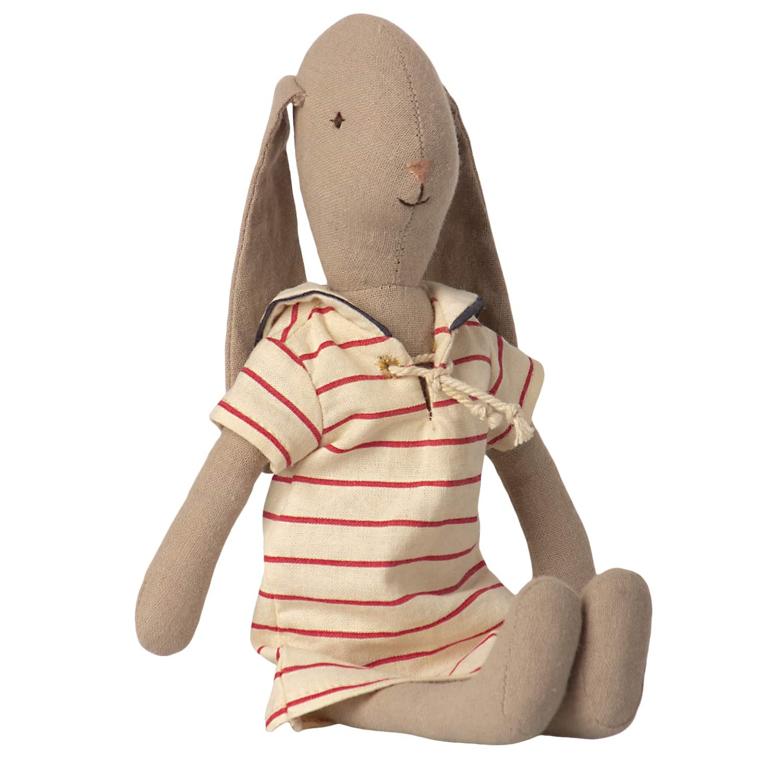 Mailegs kaninkollektion är tillverkad av mjukt, naturligt linne- och bomullstyg – vilket ger en härlig känsla och look. Denna kanin är klädd i en lekfull, randig strandklänning.