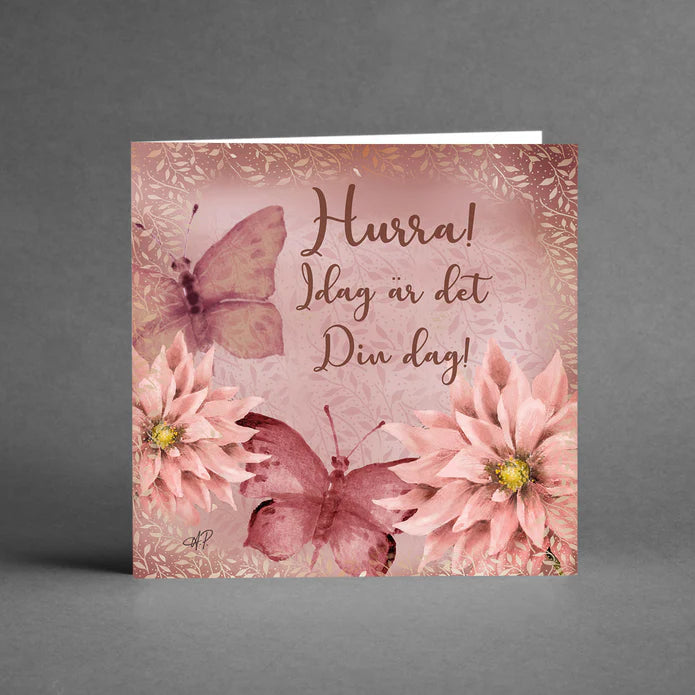 Ett pastellrosa grattiskort med texten: "Hurra! Idag är det Din dag!", motiv med blommor och fjärilar.