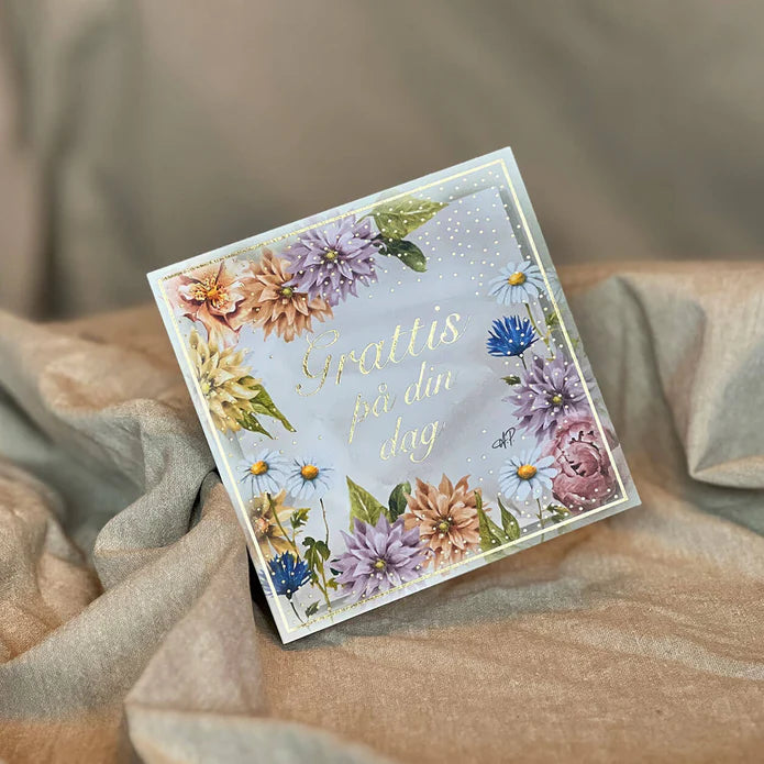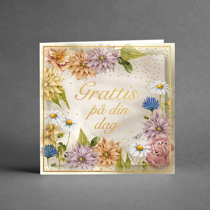 Ett vackert kort med blommor och texten "Grattis på din dag" i skimrande guldfärg.