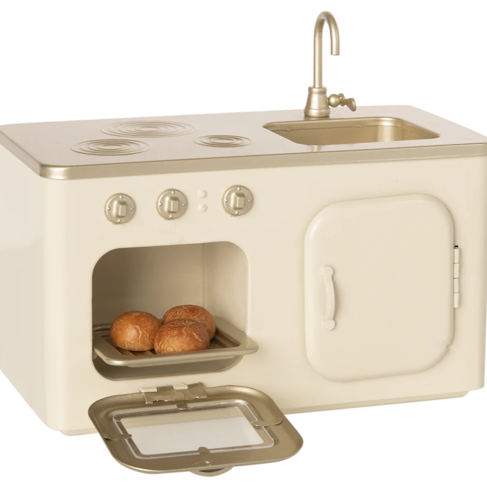 Kök till familjen Maileg mus eller kanin är ett måste i alla dockhus eller dockskåp. Ett kök med både spisplattor, ugn med bullar och plåt samt vask med kran. Vackert kök i metall för mamma mus och pappas att stå och laga mat vid. Förgyll ditt dockskåp med detta vackra metallkök med fina detaljer och låt leken börja! Detta fina kök i metall gör tillsammans med övrig köksinredning dockskåpet komplett. En underbart fin möbel till din Maileg värld!