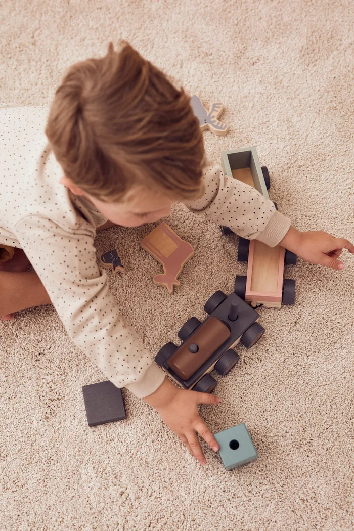 Ett tåg i trä med ett lok och två vagnar som lätt kopplas av och på.