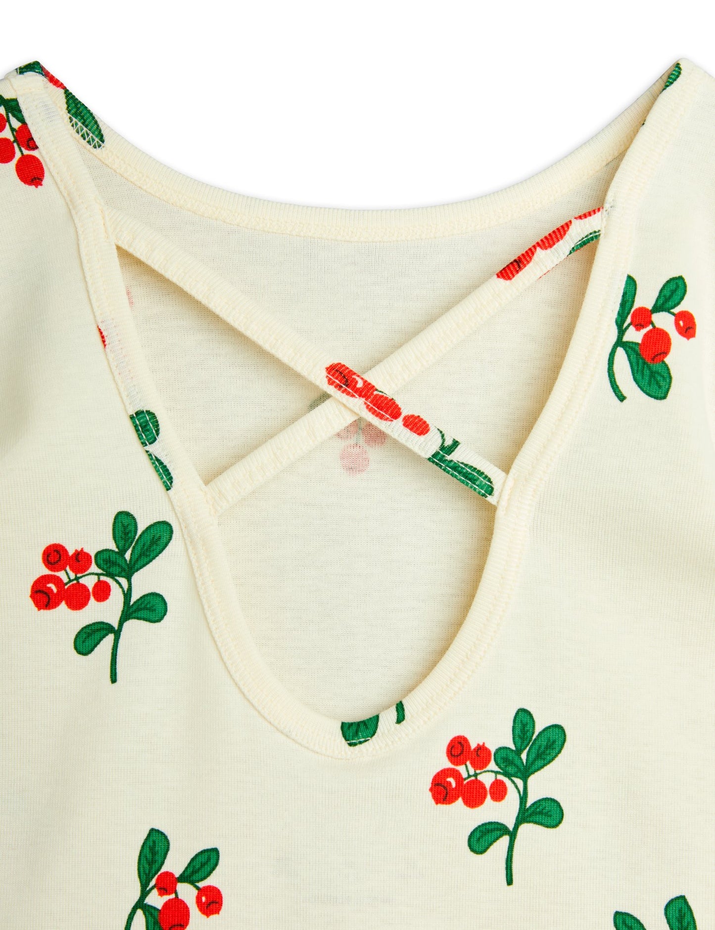 Tight fit balett-T-shirt med ett heltäckande Lingonberries mönster, gjord av 100 % GOTS-certifierad ekologisk bomull. Designad med öppen rygg med korsade band, samt med bindningar vid hals och ärmslut.
