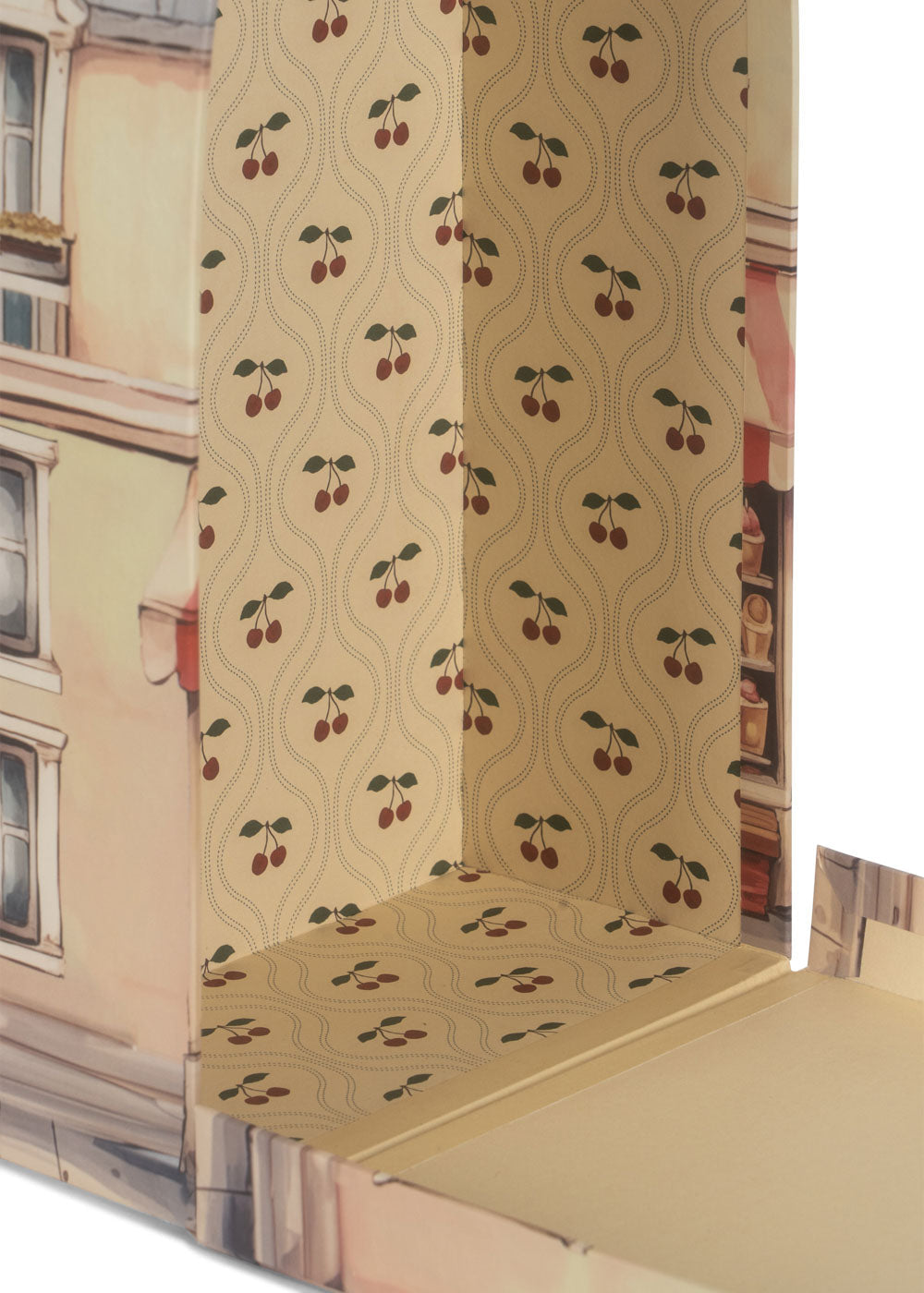 Set med två leklådor i kartong, designade som parisiska vintagebutiker. Den mindre resväskan får plats i den större. Designad med metallhandtag som är lätta att greppa.