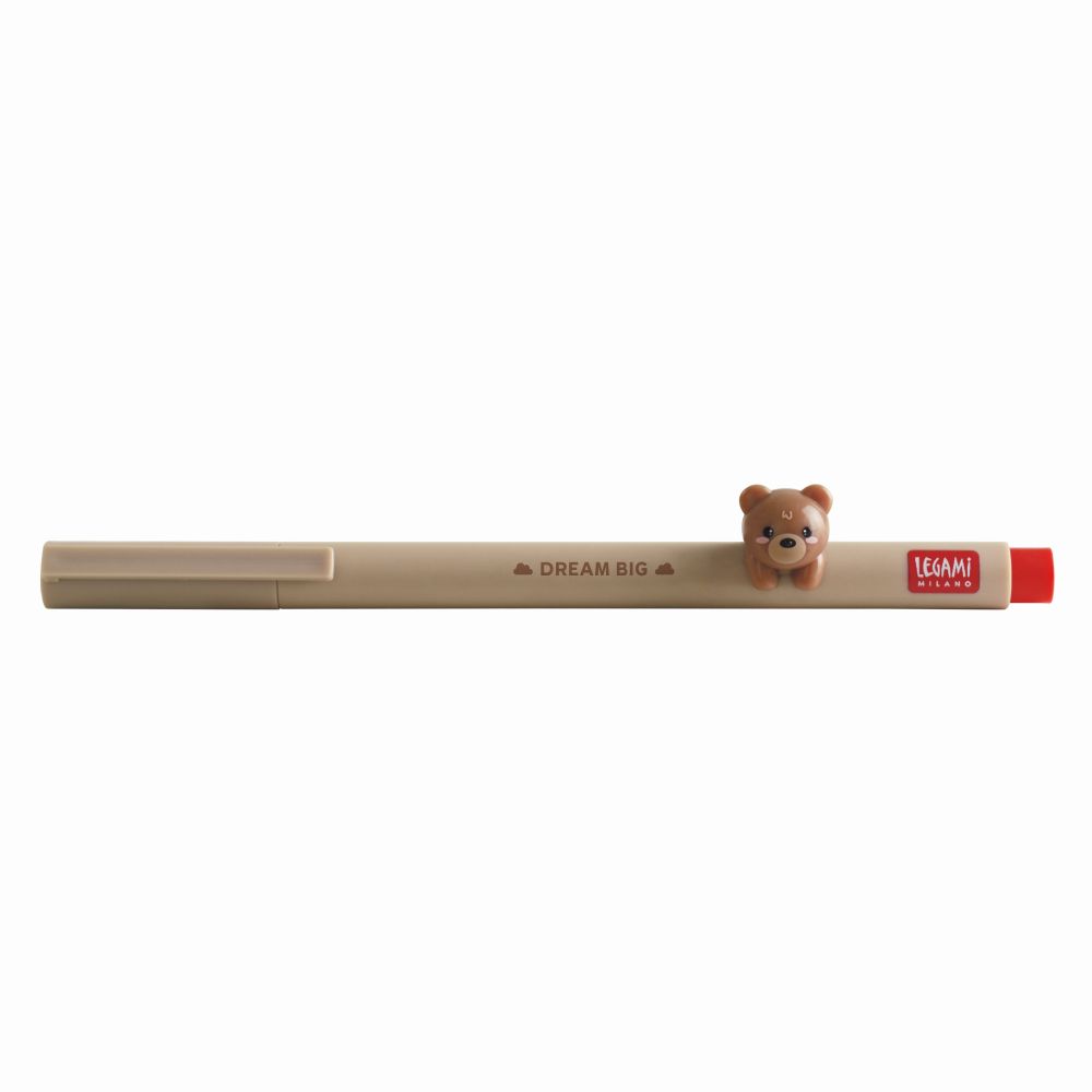Gelpenna med dekorativt litet djur som gör att pennan inte rullar ner från bordet. Djuret kan tas av och fästas på andra pennor.