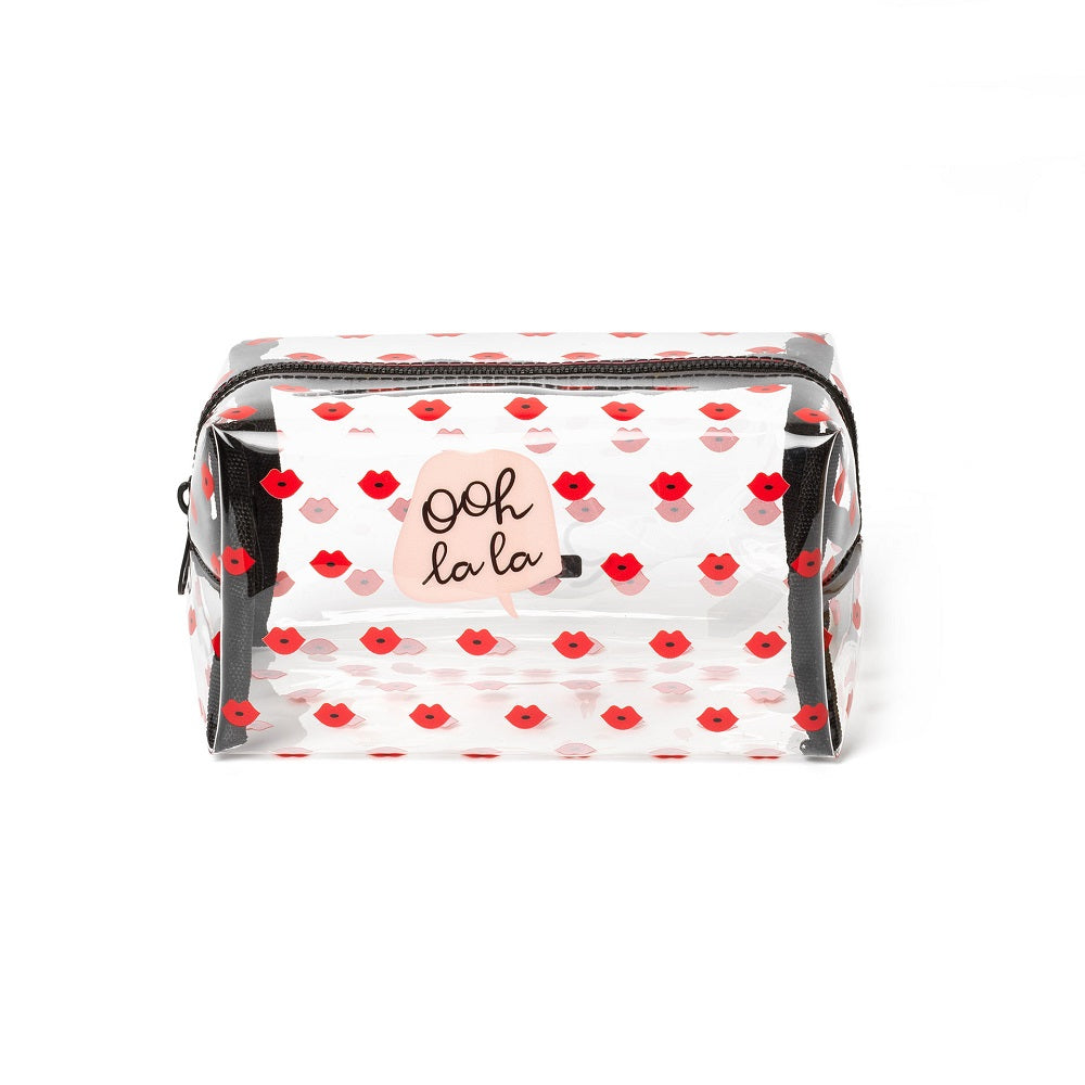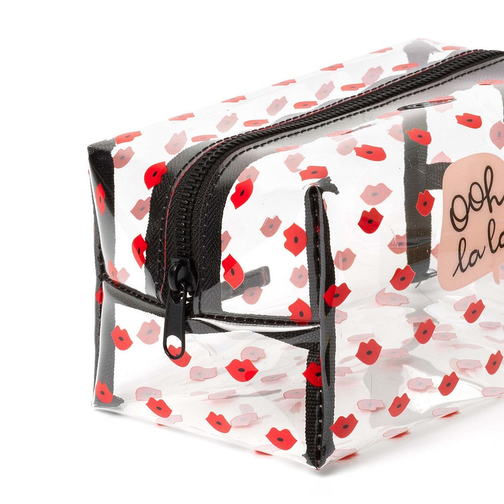 Söt make up-väska med dragkedja. Täckt med små pussarnas och texten ”Ohlala” på ena sidan.