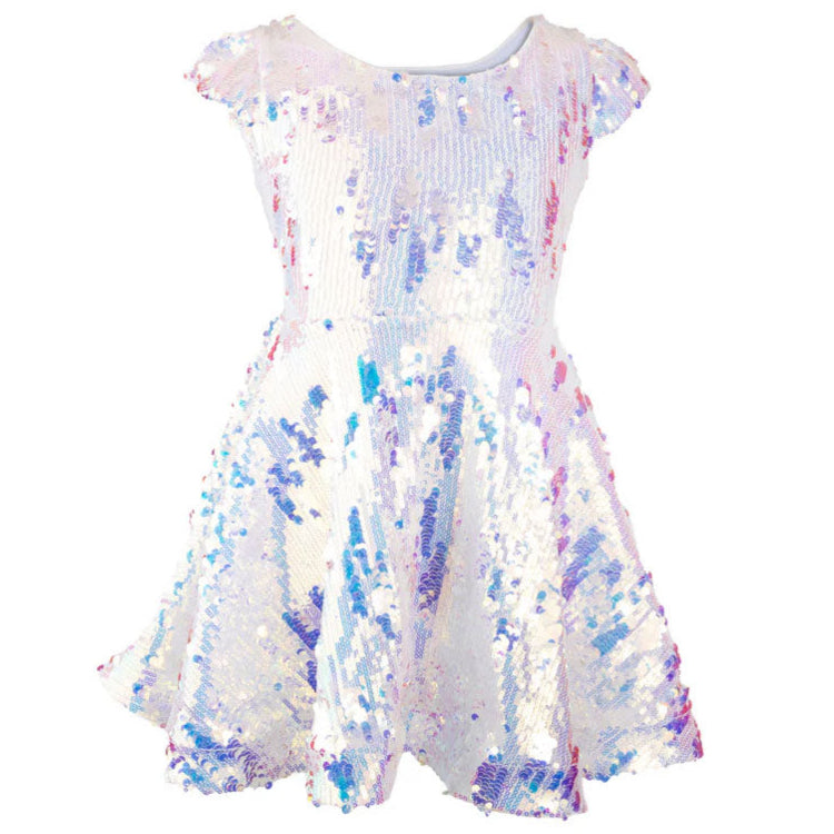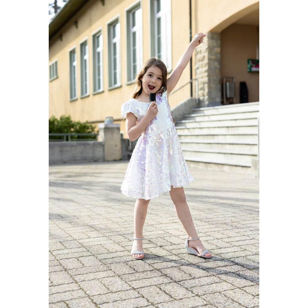 Gör dig redo att glittra som en sann superstjärna i Sequins Concert Queen-klänningen! Inspirerad av energin och glamouren från en slutsåld show är den här klänningen gjord för stigande stjärnor som älskar att glänsa. Klänningen är täckt av en blandning av stora och små skimrande paljetter och lyser vit vid första anblicken, men reflekterar mjuka lila och regnbågsfärgade nyanser när den rör sig – precis som det bländande ljuset från ett liveframträdande.