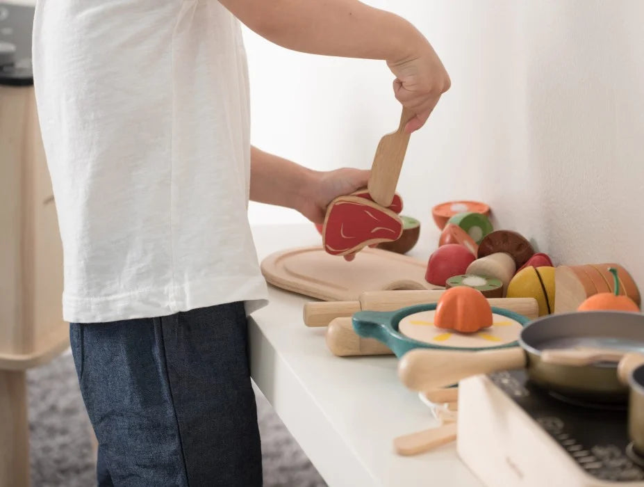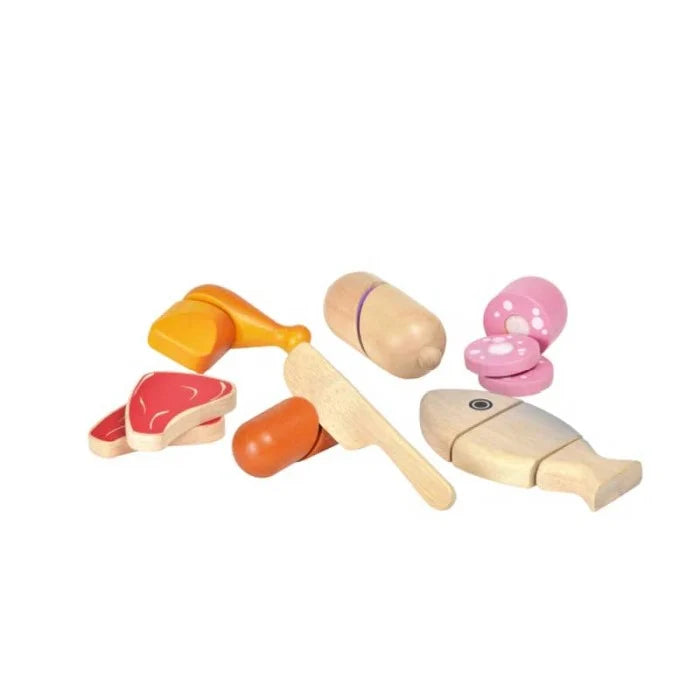 Set om låtsaskött i trä. Innehåller olika korvar, kycklingklubba, fisk och kotlett - perfekt för att leka affär med eller för minikocken där hemma!
