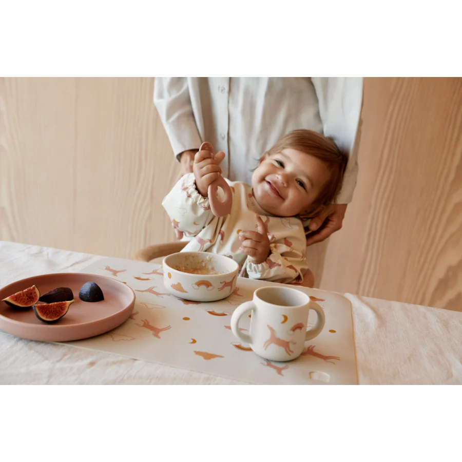 Lätt haklapp för spädbarn och småbarn som lär sig äta på egen hand. De elastiska ärmsluten säkerställer en åtsittande passform och den främre fickan fångar upp spilld mat. Cape-haklappen är tillverkad av slitstark, återvunnen polyester och är lätt att rengöra och kan fällas ihop för kompakt förvaring hemma eller på språng.