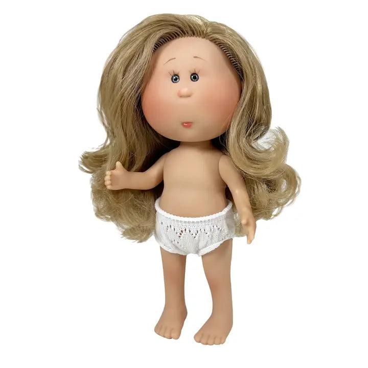 Dockan Mia har ett realistiskt utseende med uttrycksfulla ögon, vackra ansiktsdrag och mjukt, blont hår som går att borsta och styla. Perfekt att klä upp i olika dockkläder efter eget val! 👗
