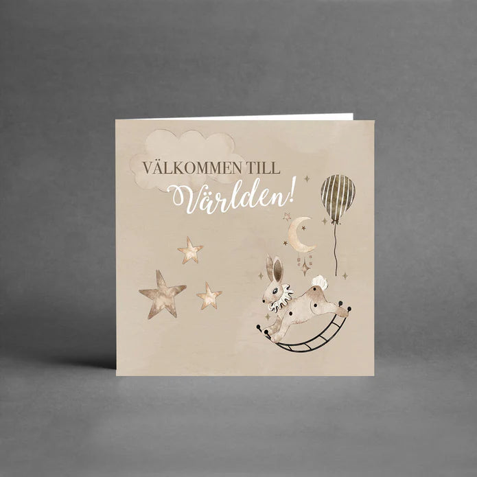 Ett litet kort med text : "Välkommen till Världen!"