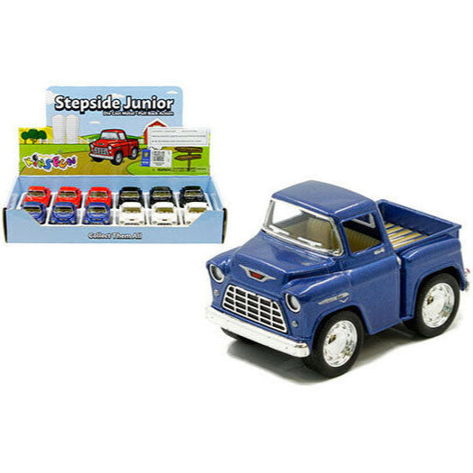 1955 Chevy Stepside Pick-Up-lastbilar i olika färger – svart, röd, blå och gräddvit – varje bil är 5 cm lång