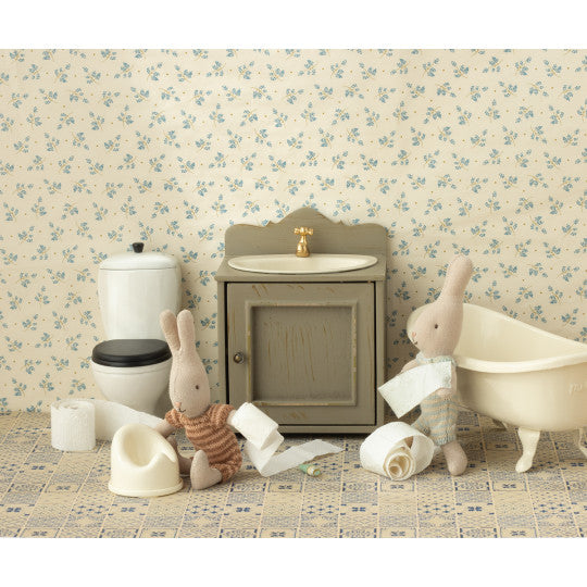 Vackert handfat med skåp som har knopp som handtag och ett hyllplan för förvaring i skåpet samt med vask med mässingskran. Ett tvättställ som passar bra i Maileg-huset eller annat dockhus. Passar bäst för kaniner och teddy men går också bra till mössen. Komplettera gärna med toalett, potta, badkar, tvättmaskin, tvättställ och strykbräda med strykjärn så har du ett komplett badrum i ditt dockskåp.