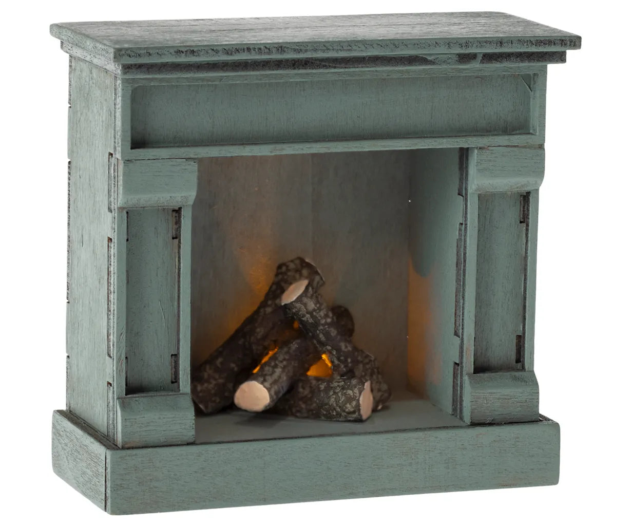 Underbar blå öppen spis med ljus (lampa) som håller ditt slott, dockhus eller miniatyrhem varmt med en värmande brasa. Den har ett verklighetstroget och autentiskt utseende med vintagefinish. Brasan skapar ett varmt sken och en mysig stämning i vinter och till jul. Glöm inte att släcka lampan när leken är slut. Batteriet till lampan byts lätt ut av en vuxen.