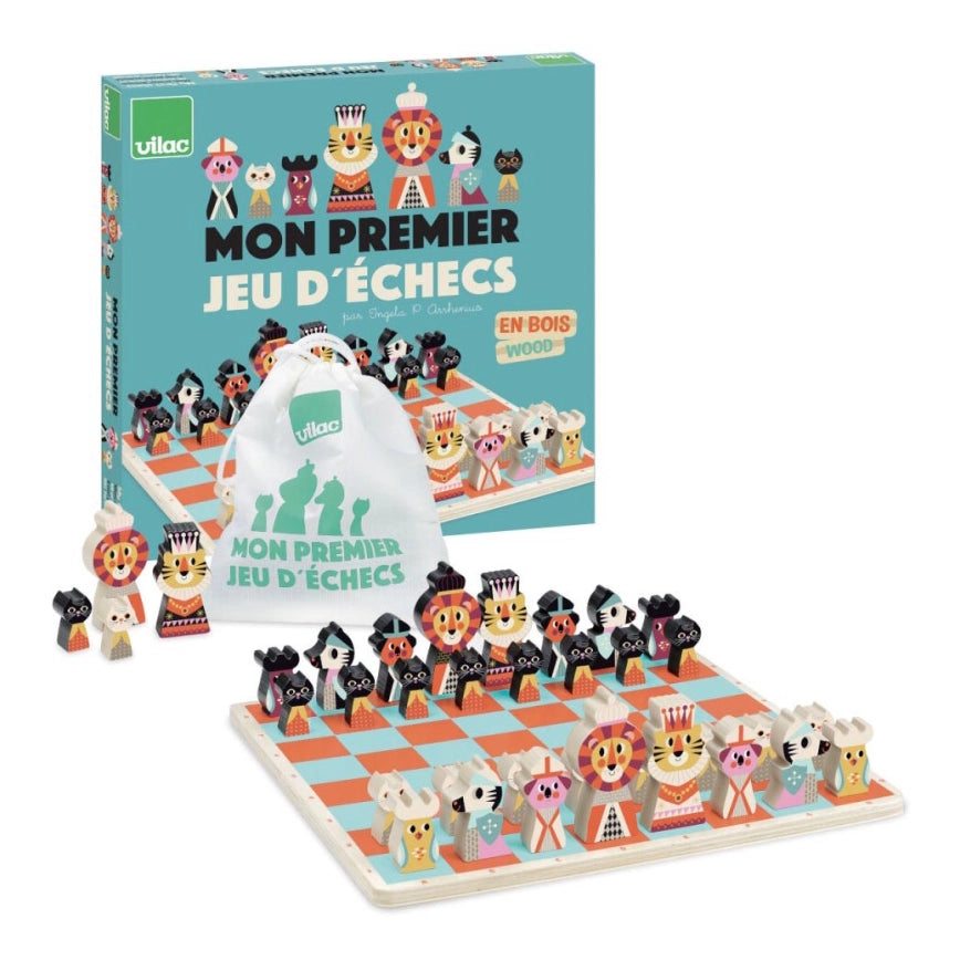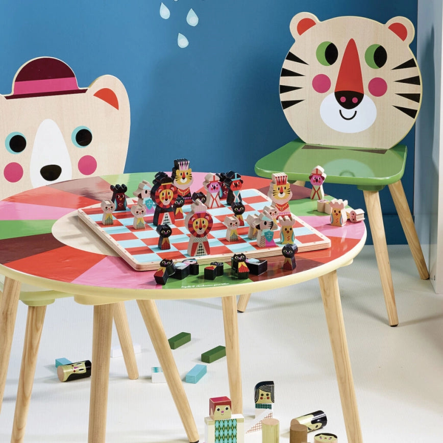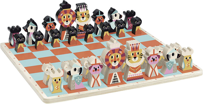 Tillverkat i trä och målat som olika djur i snygga, klara färger. Perfekt till den som vill lära sig spelet för första gången, men lika fint till dem som är gamla schack-veteraner.