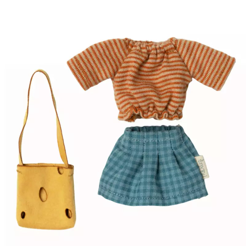 Mamma Musen har på sig en ny randig tröja, blå kjol och den roliga väskan med det vackra detaljarbetet av små osthål.