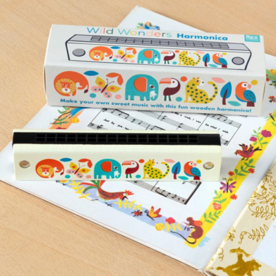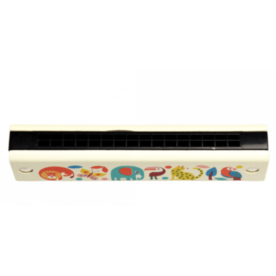 Ett munspel i trä, målat med olika motiv på var sida. Munspelet är utformat för barn och uppmanar barnets musikaliska förmåga. Ett roligt leksaksinstrument för den lilla musikanten.