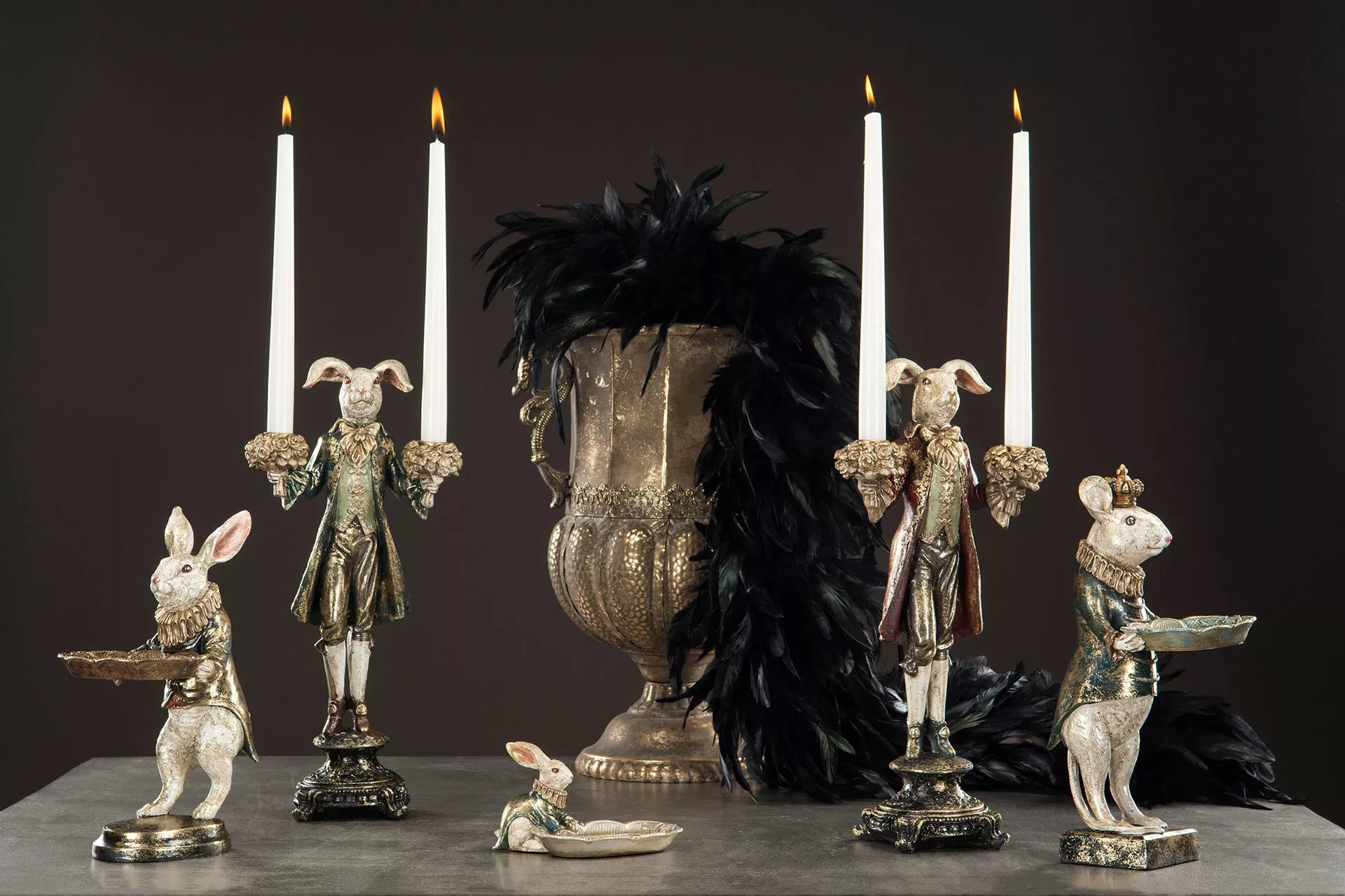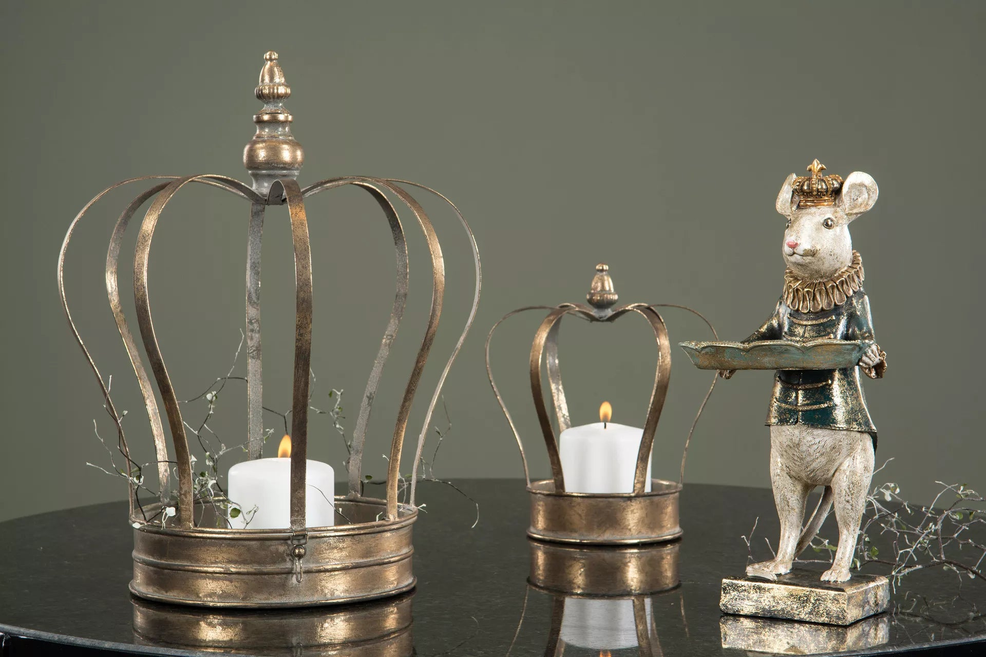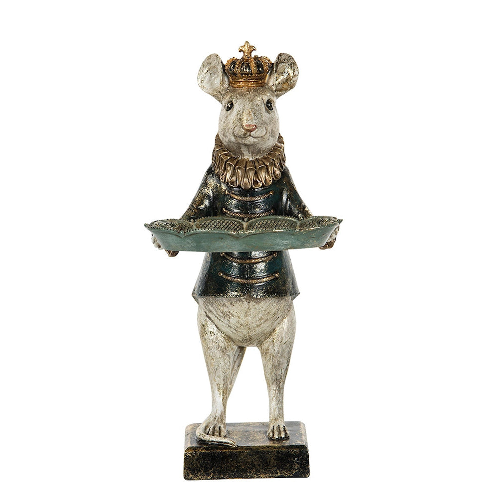 Denna mus med krona som håller i en bricka är en fin dekoration som du kan ha på ett soffbord eller en bänk i vardagsrummet. Tillverkad av poly.