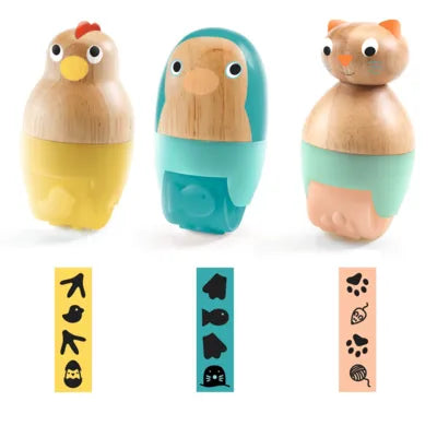 Dessa ergonomiska stämplar (eller små mönster kavlar) är tillverkade av FSC®️ certifierat trä i former som är lätta att hantera även för riktigt små barn och har detaljer av filt samt rullar av plast med fyra små upphöjda bilder som kan associeras med djuret som stämpeln föreställer (fotspår, kyckling, mat eller leksak till exempel. Ett pyssel som kan hjälpa till att utveckla barnets fingerfärdighet och precision samt kan avnjutas om och om igen.
