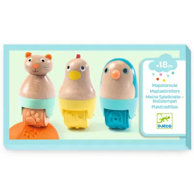 Ett set med roliga rullande stämplar med enkel design i form av tre olika djur, som används för att göra olika märken eller mönster i lek lera.