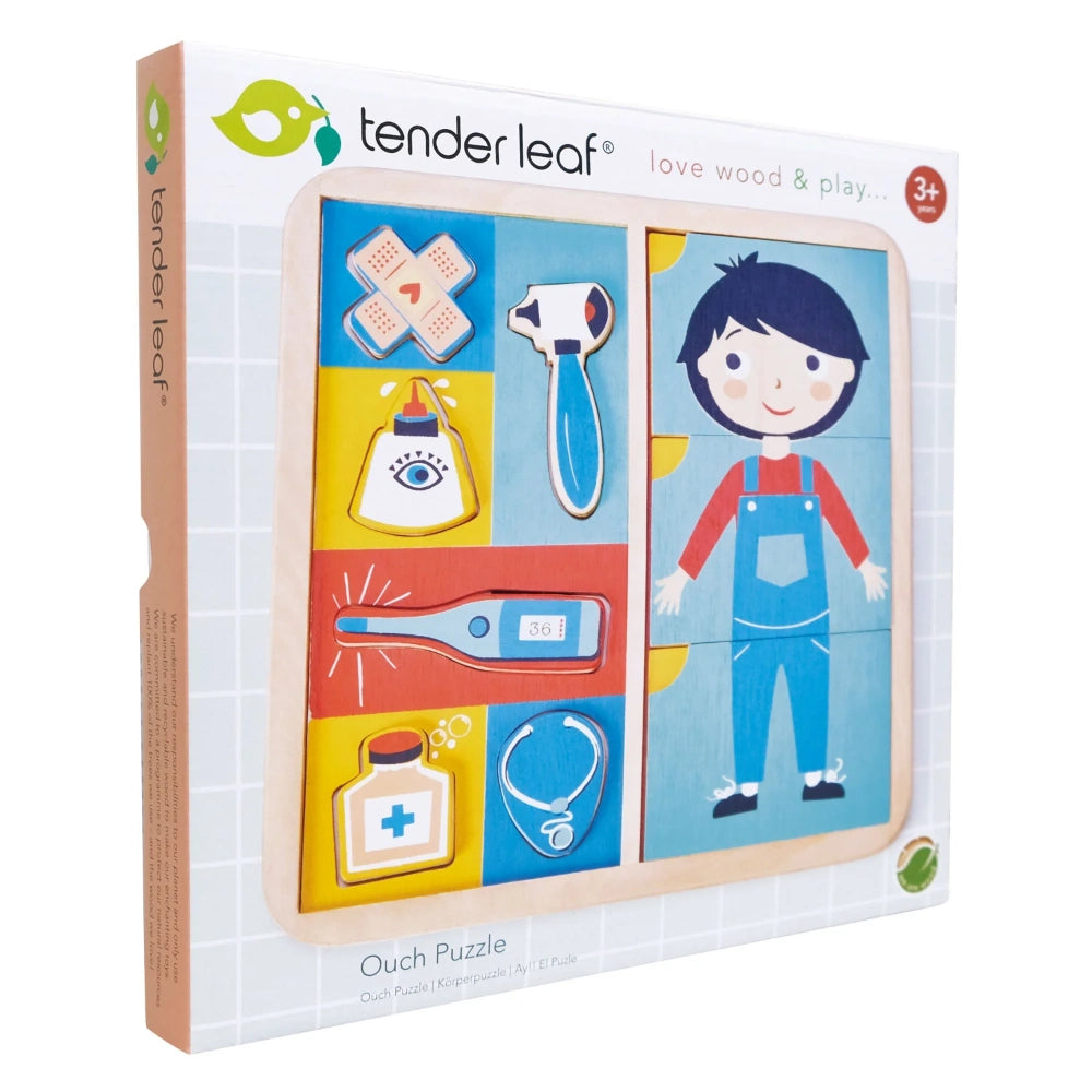 Tenderleaf Toys Ouch Puzzle är ett pedagogiskt pussel med 12 bitar som utforskar hur kroppen är uppbyggd. Vad gör oss ont och vad gör oss bättre!