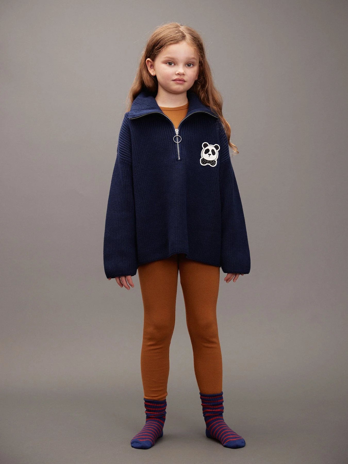 Mysig stickad tröja med Mini Rodinis ikoniska panda märke gjord av 100 % GOTS-certifierad ekologisk bomull. Designad i en lös passform med halv dragkedja.